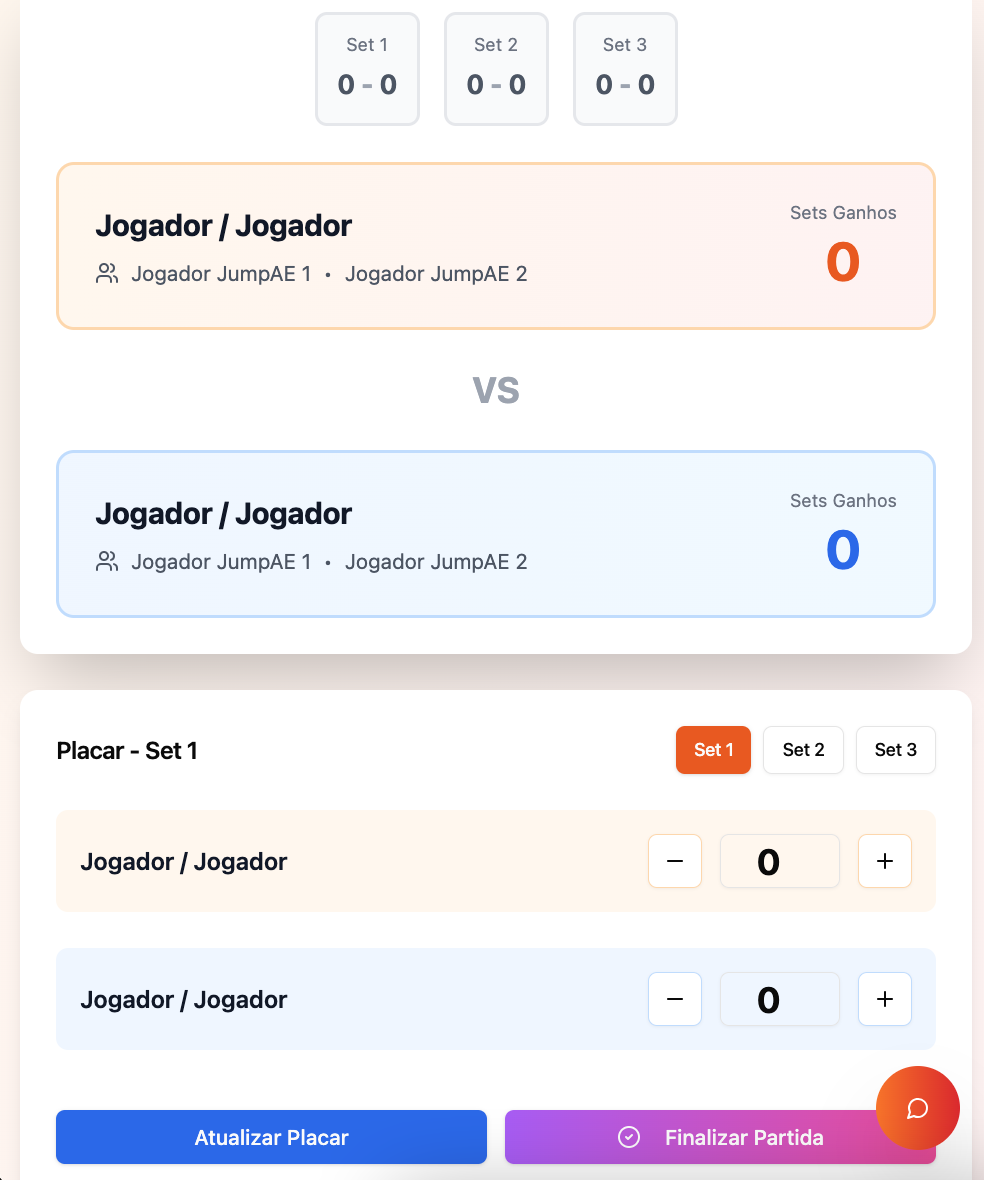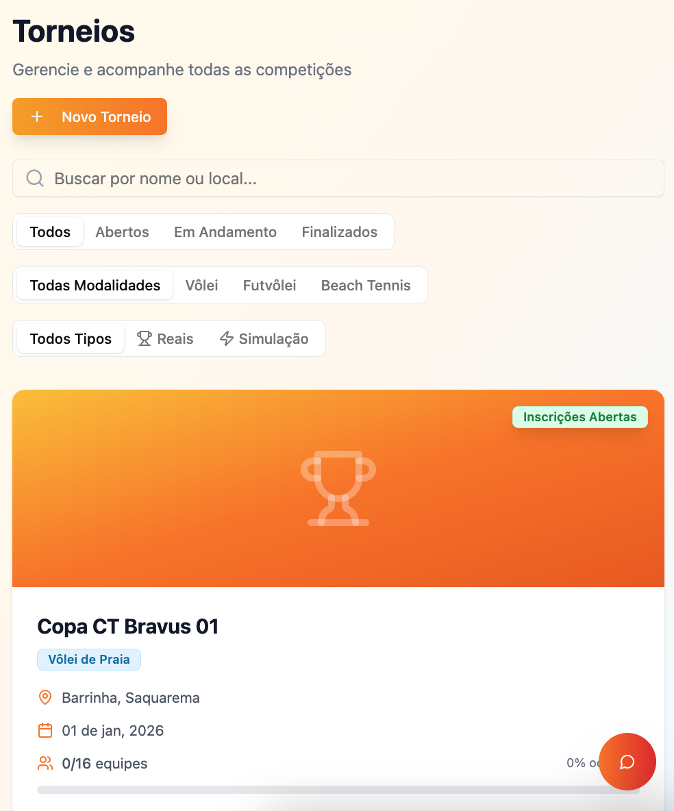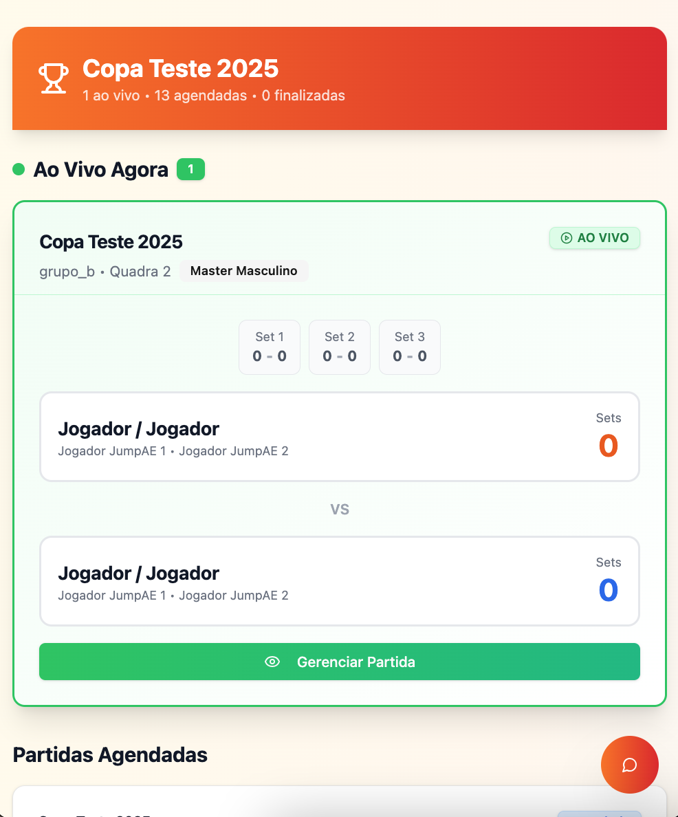 Esqueça as anotações na areia. Agora você e sua torcida acompanham todos os jogos em tempo real pelo celular. Acabou a partida na quadra 3?