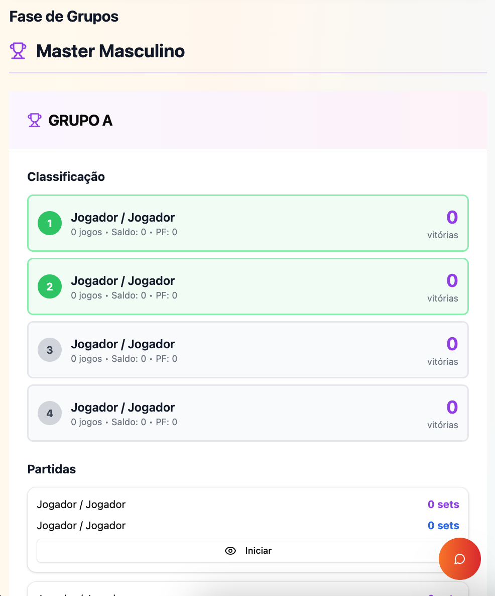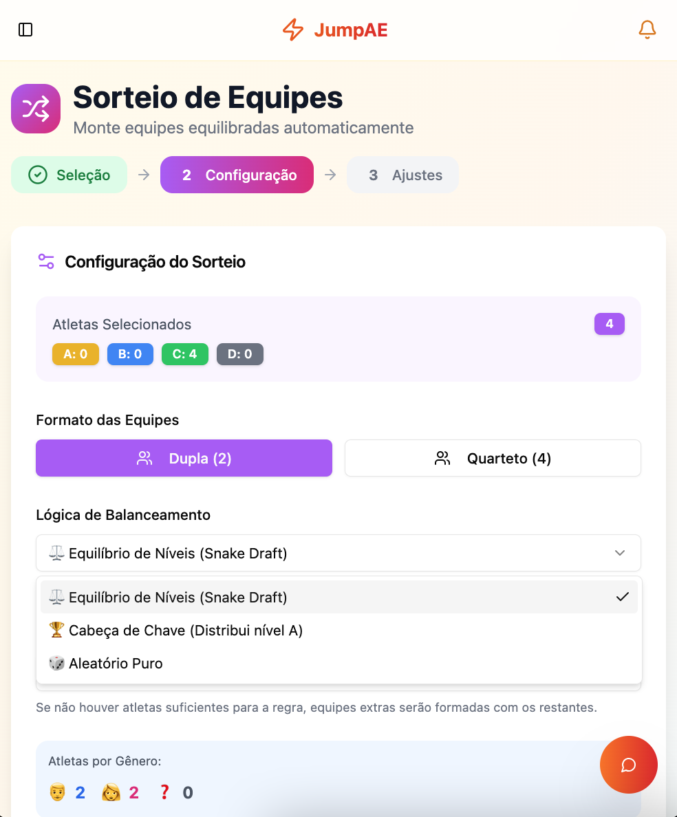 Sabe aquele torneio que sempre fica com times desequilibrados? Nosso app tem um sistema de sorteio inteligente que garante que as duplas ou quartetos sejam montados de forma justa, misturando os atletas mais experientes (nível A, B) com os iniciantes (nível C/D).
